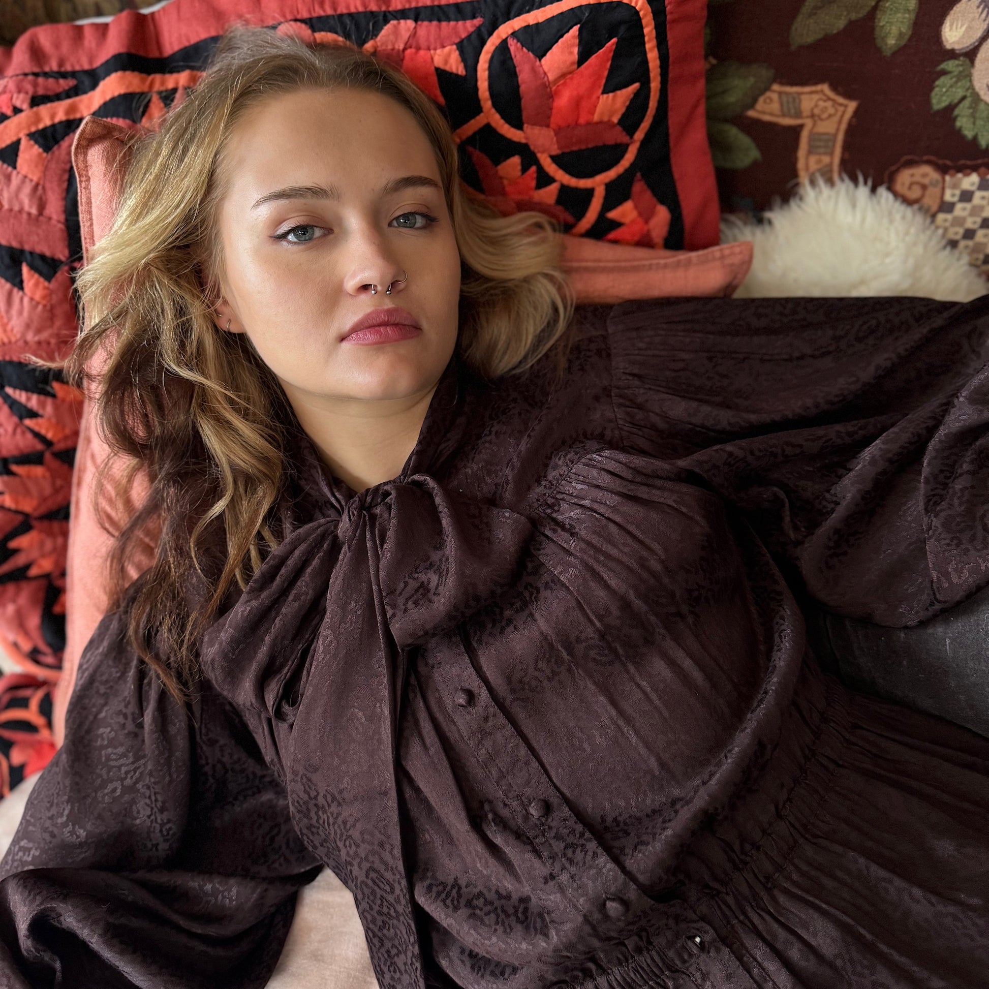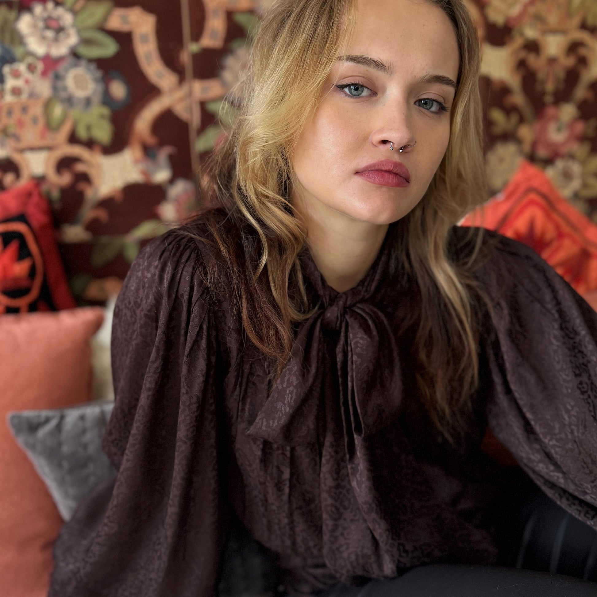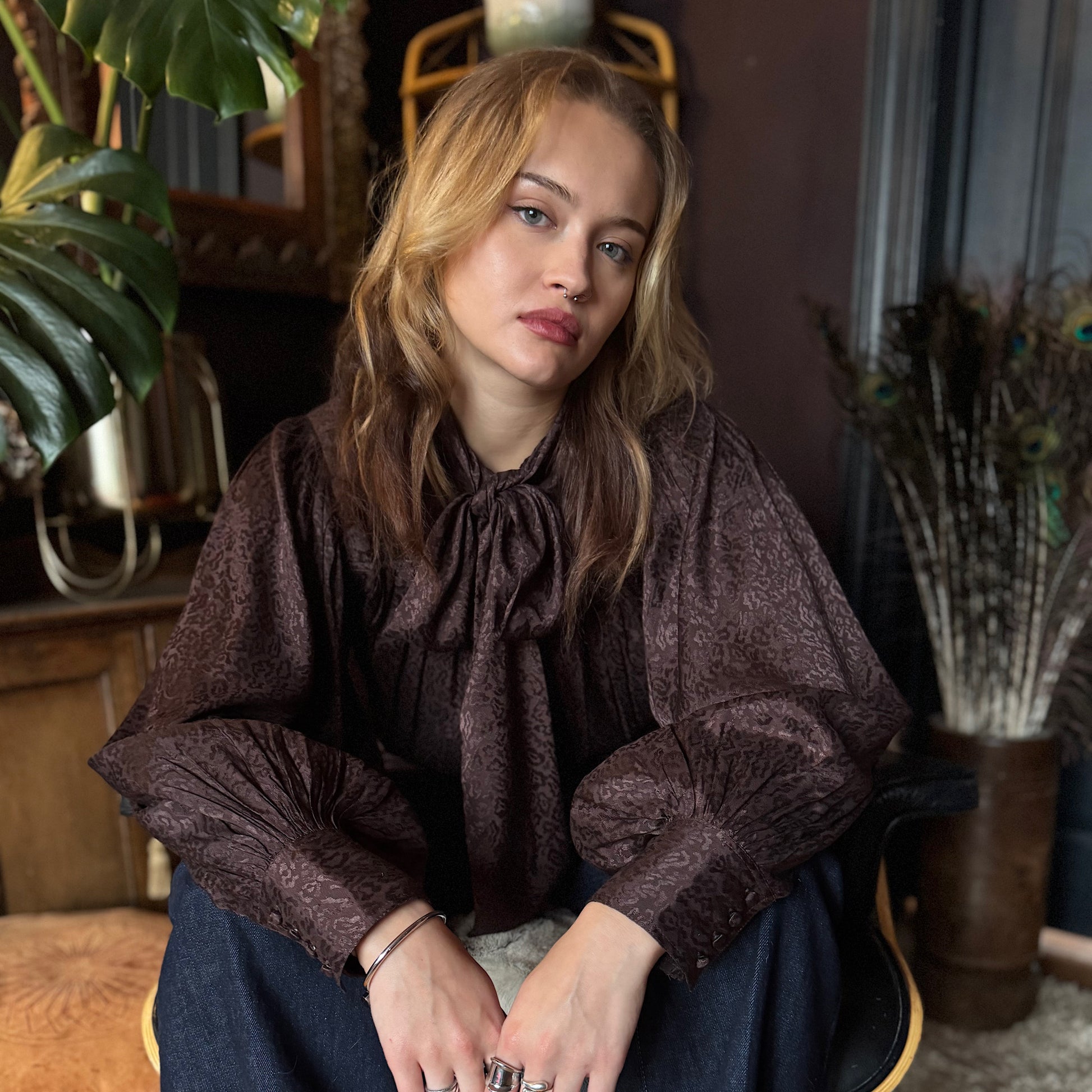 Delphi is a statement take on the classic pussy bow blouse - cut in a rich chocolate viscose jacquard satin in a leopard print design.
