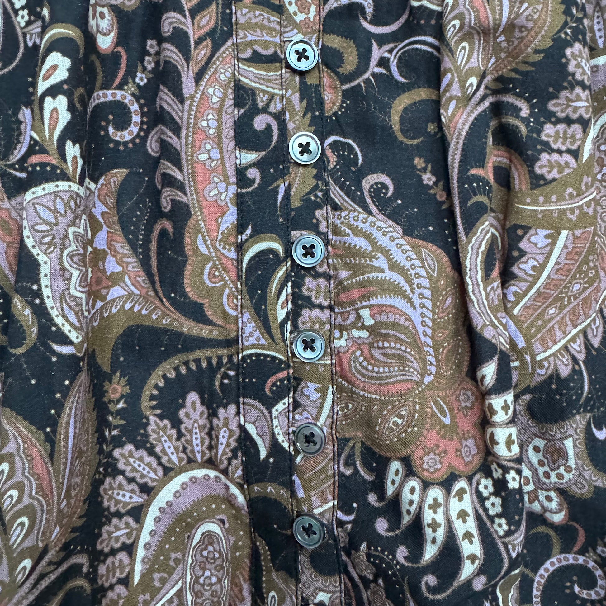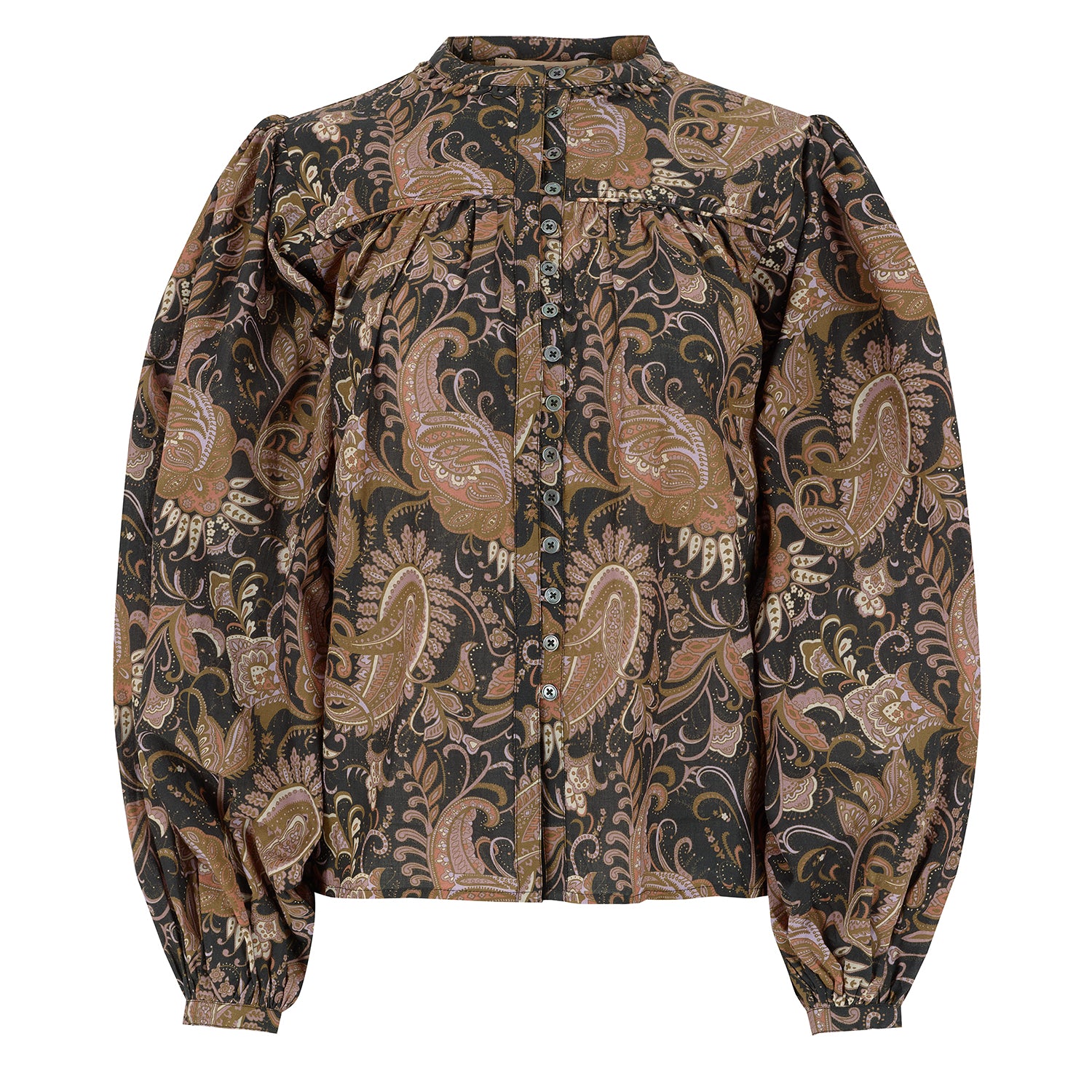 Cut in our new washed Twilight Paisley print that blends deep twilight tones with soft bronze and blush highlights. Designed with billowy sleeves that gather at the wrist into a slim cuff and with the same slim round neckline which has delicate looped piping detailing.