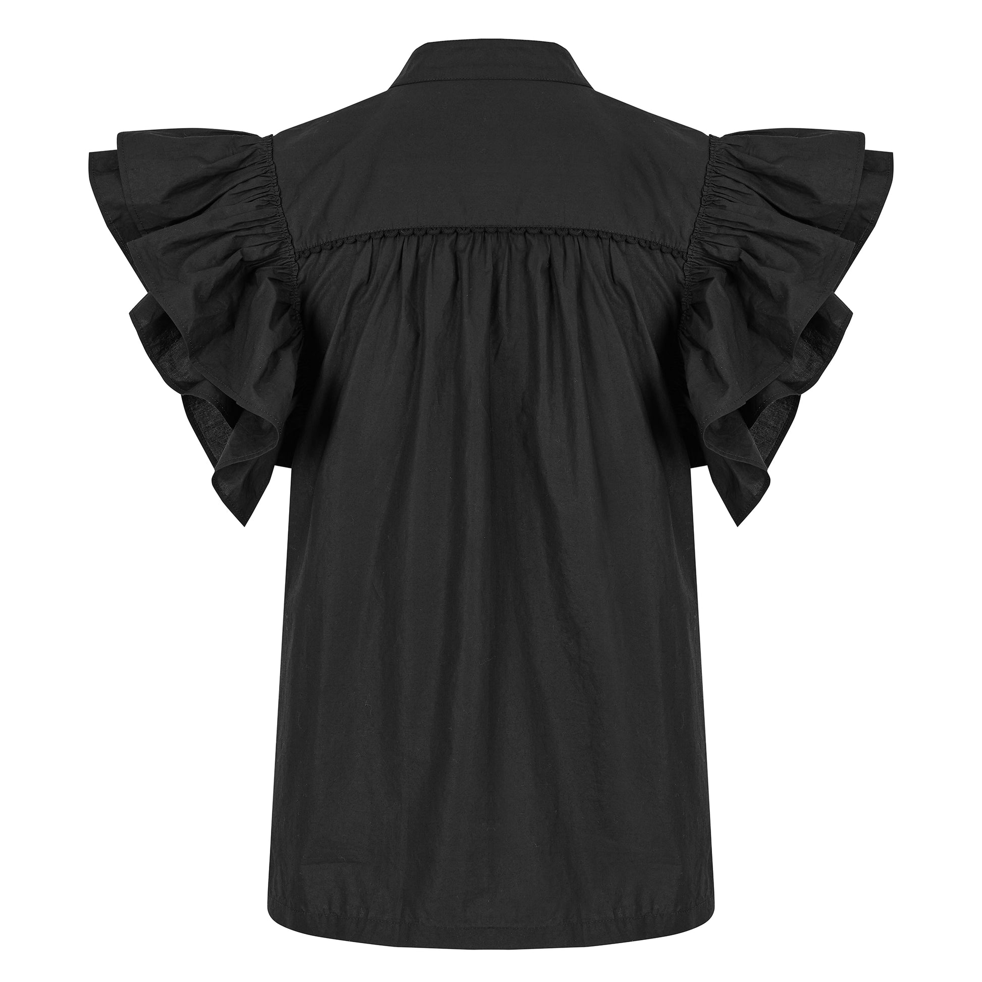 Mia frill blouse in plain black cotton lawn with frill sleeves and tie neck.
