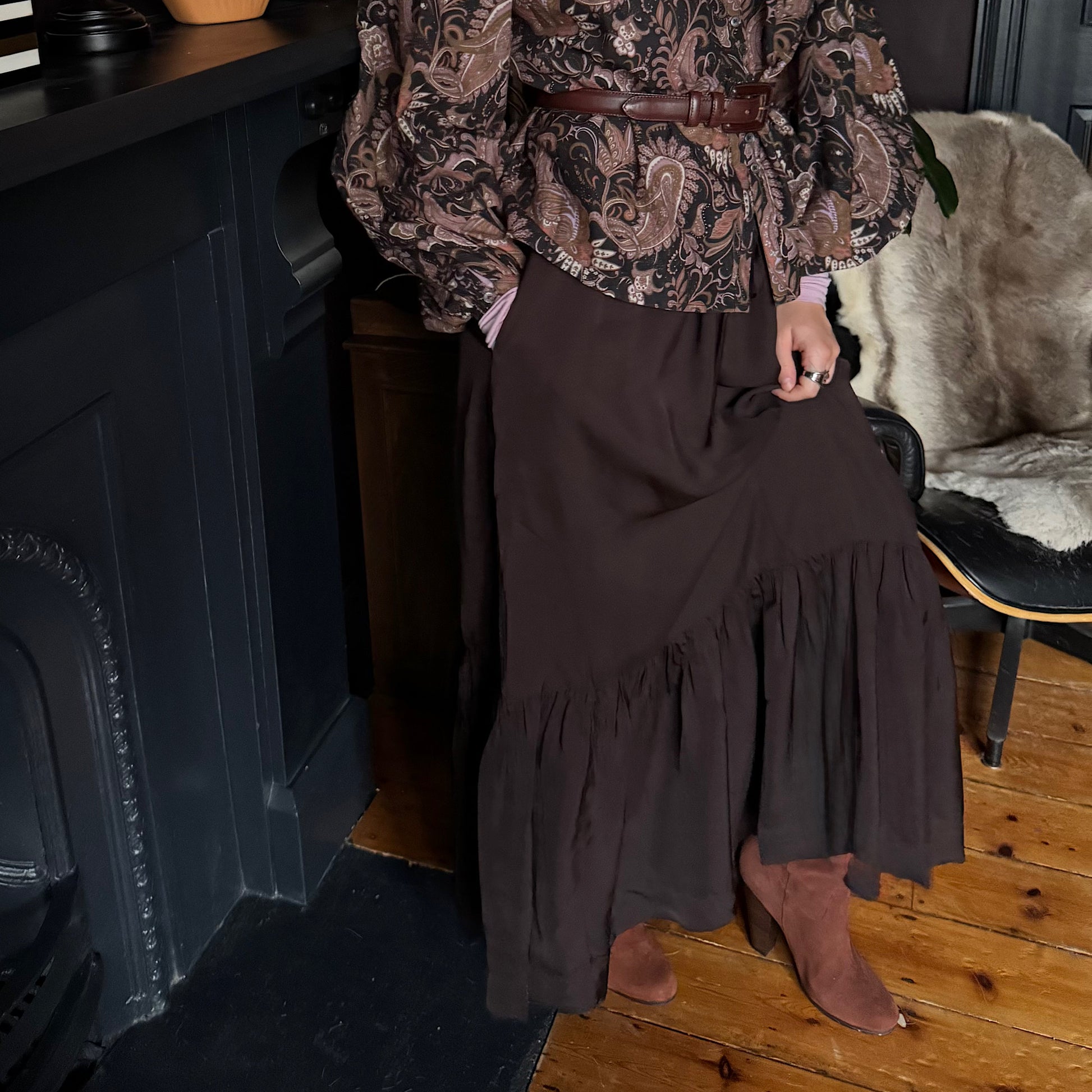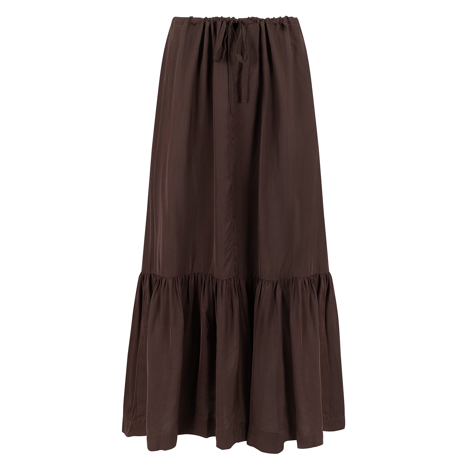 Stella skirt in rich chocolate satin viscose modal with deep frill hem and drawstring waist.